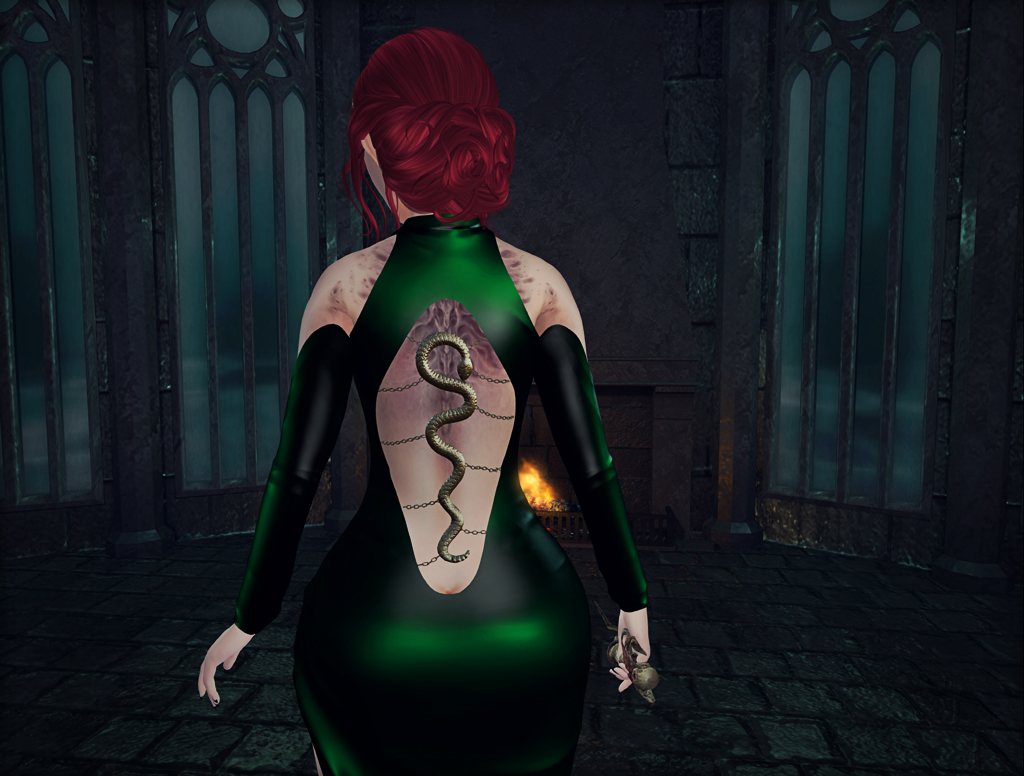 This bad girl is a returning Slytherine... She's been scarred by the snakes that the house takes as it's mascot. Her scars are shown proudly - she fought for those scars and she wants to show them off!